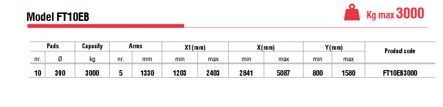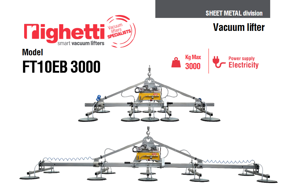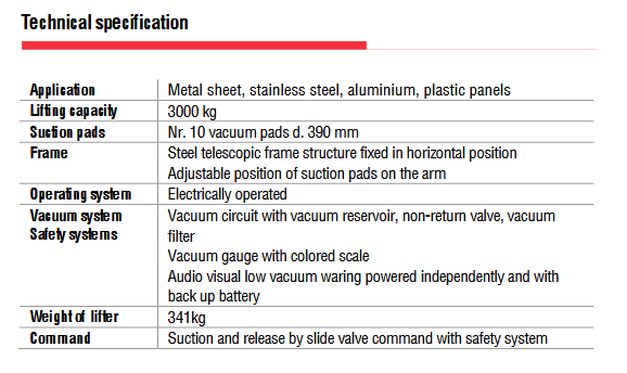 Τα 10 μαξιλαράκια αναρρόφησής του, κατασκευασμένα από ειδικό βουλκανισμένο καουτσούκ, ανθεκτικό στο λάδι, τοποθετούνται σε πέντε εγκάρσιους βραχίονες για να εξασφαλίζουν σταθερό κράτημα και στήριξη ακόμη και στη μεγαλύτερη λαμαρίνα. Αυτό το μοντέλο με ηλεκτρική τροφοδοσία είναι ιδανικό για χρήση σε γερανούς και άλλα μέσα ανύψωσης