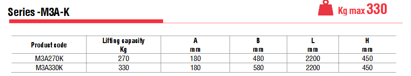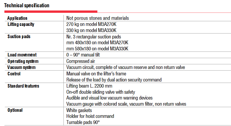 Η σειρά M3A-K είναι μια σειρά ανυψωτικών κενού ειδικά για επιφάνειες κουζίνας με ανυψωτική ικανότητα έως 330 κιλά.