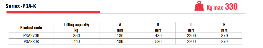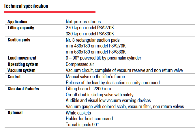 Το P3A-K είναι μια σειρά ανυψωτικών κενού που είναι ειδικά για επιφάνειες κουζίνας και έχουν μέγιστη ανυψωτική ικανότητα 330 kg.