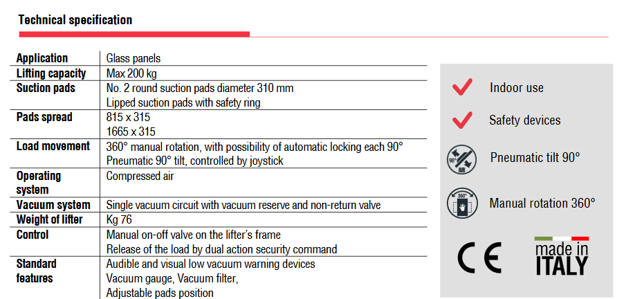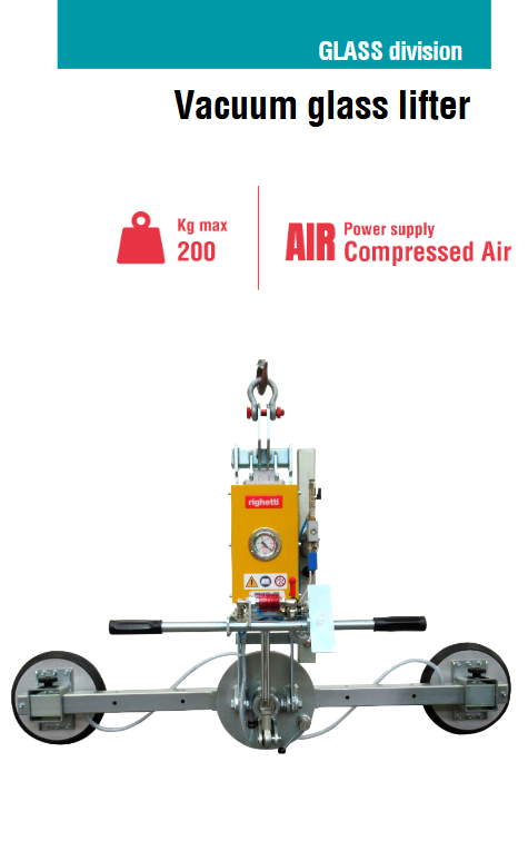 Το μοντέλο VA2 RCMBP είναι ένα γυάλινο ανυψωτικό κενού ειδικά για εσωτερική χρήση, με δύο επιθέματα αναρρόφησης d. 310 mm, με πεπιεσμένο αέρα και ανυψωτική ικανότητα έως 200 kg.