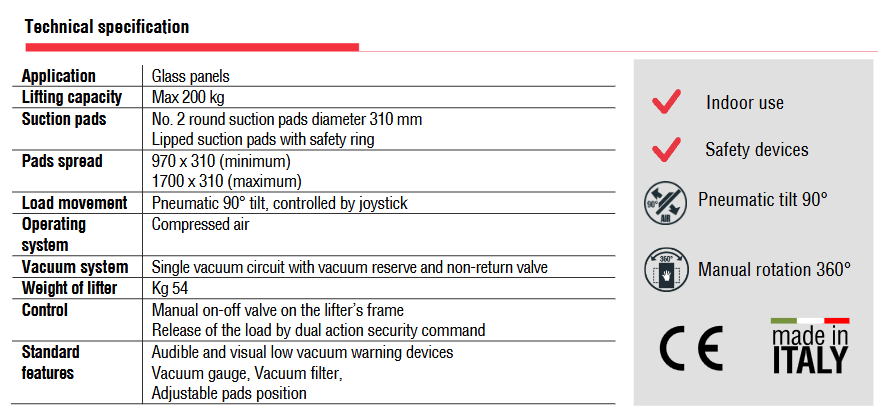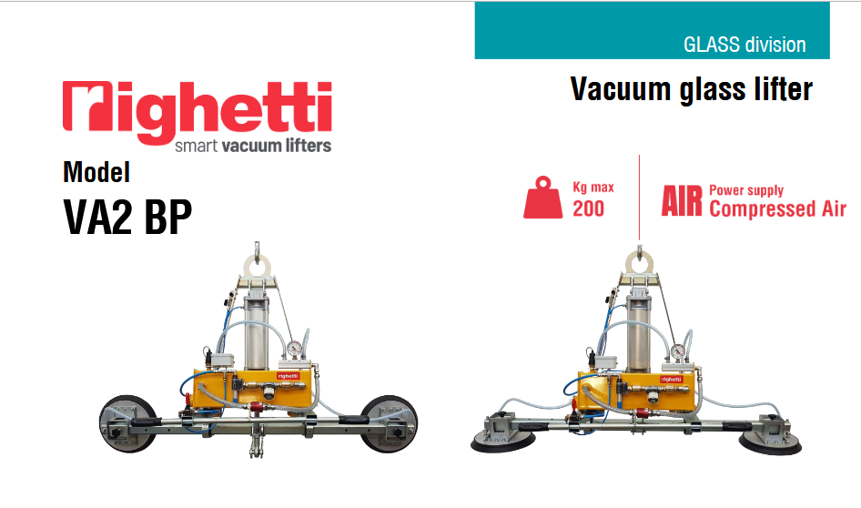 Το μοντέλο VA2 BP είναι ένα γυάλινο ανυψωτικό κενού ειδικά για εσωτερική χρήση, με δύο επιθέματα αναρρόφησης d. 310 mm, με πεπιεσμένο αέρα και ανυψωτική ικανότητα έως 200 kg.