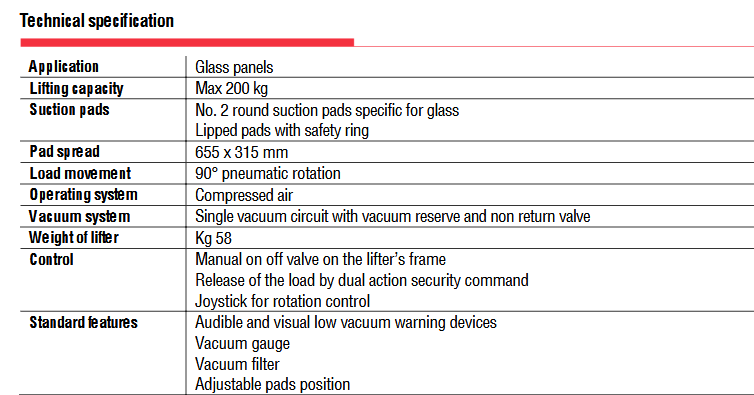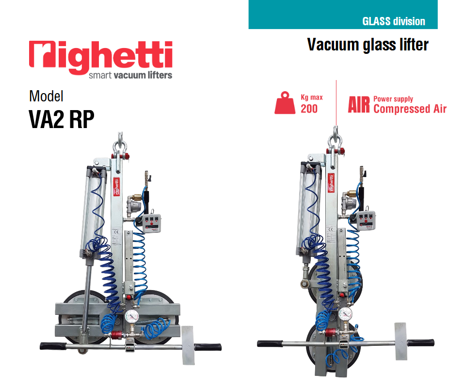 Το μοντέλο VA2 RP είναι ένα ανυψωτικό γυαλιού κενού ειδικά για χρήση σε εσωτερικούς χώρους, με δύο επιθέματα αναρρόφησης d. 390 mm, πεπιεσμένος αέρας με ανυψωτική ικανότητα έως 200 kg.