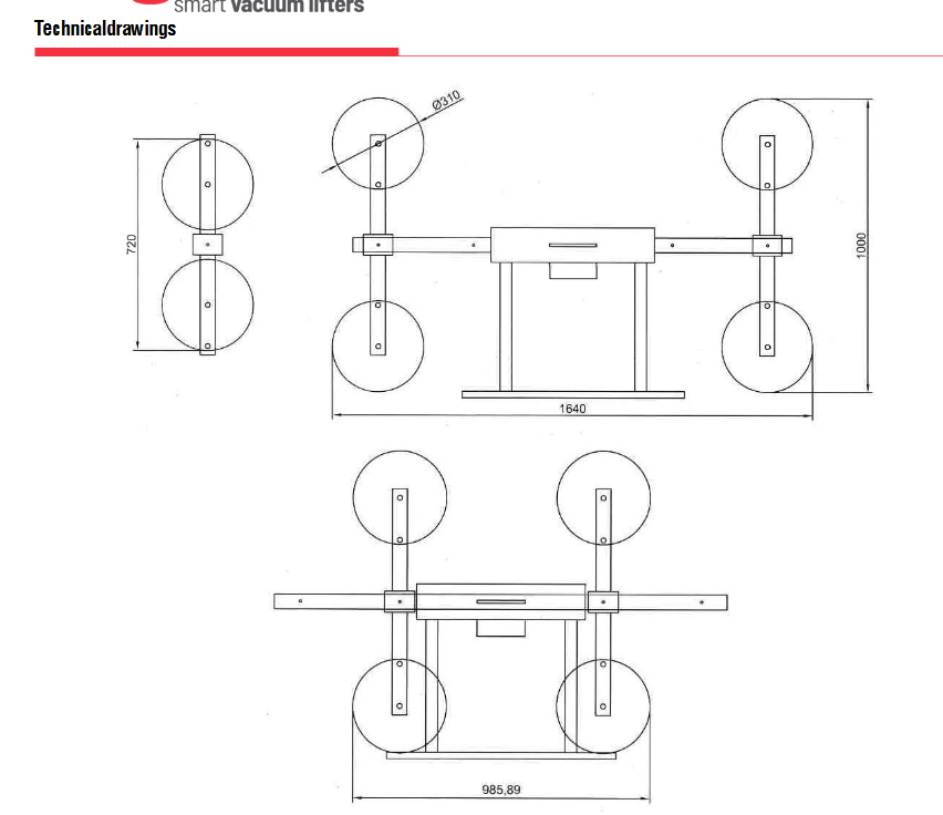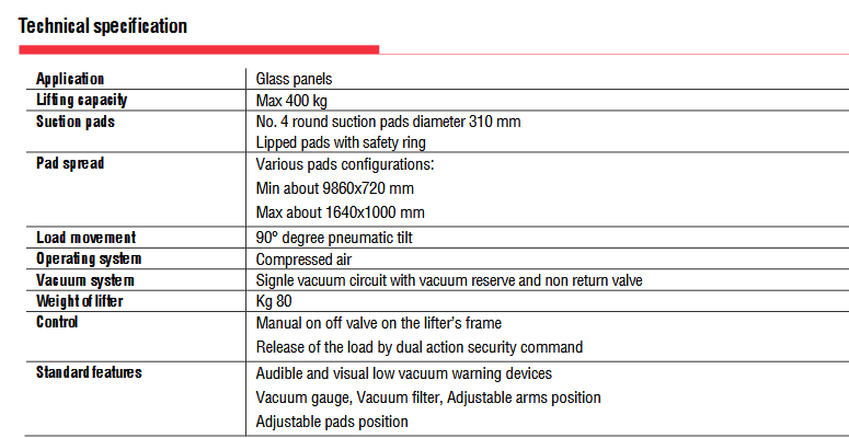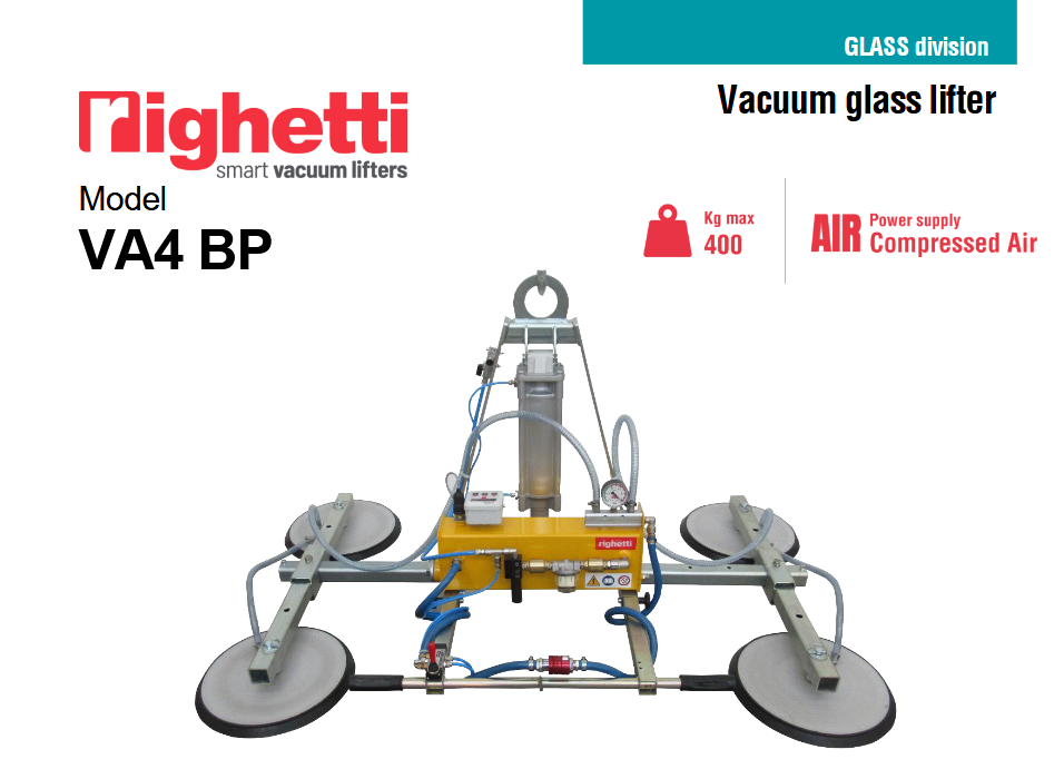 Το μοντέλο VA4 BP είναι ένα ανυψωτικό γυαλιού κενού ειδικά για χρήση σε εσωτερικούς χώρους, με τέσσερις βεντούζες d. 310 mm, πεπιεσμένος αέρας με ανυψωτική ικανότητα 400 Kg.