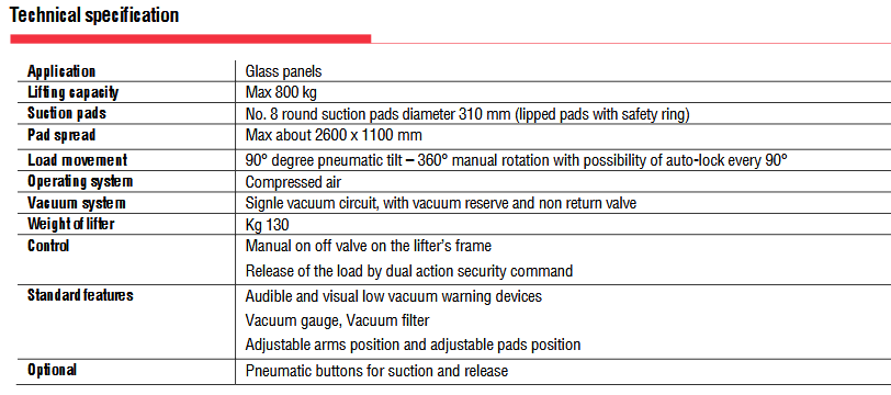 Το μοντέλο V84 RCMBP είναι ένα ανυψωτικό γυαλιού κενού ειδικά για χρήση σε εσωτερικούς χώρους, με οκτώ βεντούζες d. 310 mm, με πεπιεσμένο αέρα, με ανυψωτική ικανότητα 800Kg.