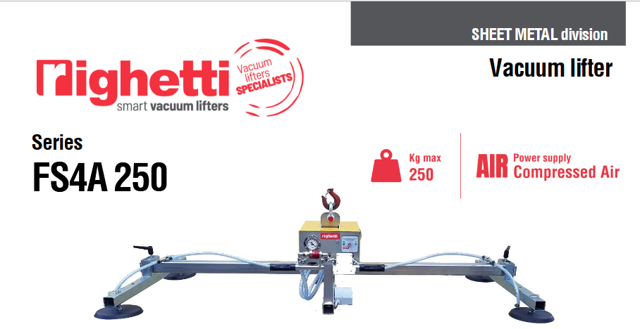 Το Vacuum Lifter για λαμαρίνες FS4A 250 είναι ένα μοντέλο με σύστημα λειτουργίας πεπιεσμένου αέρα και απαιτεί σύνδεση με το πνευματικό σύστημα.