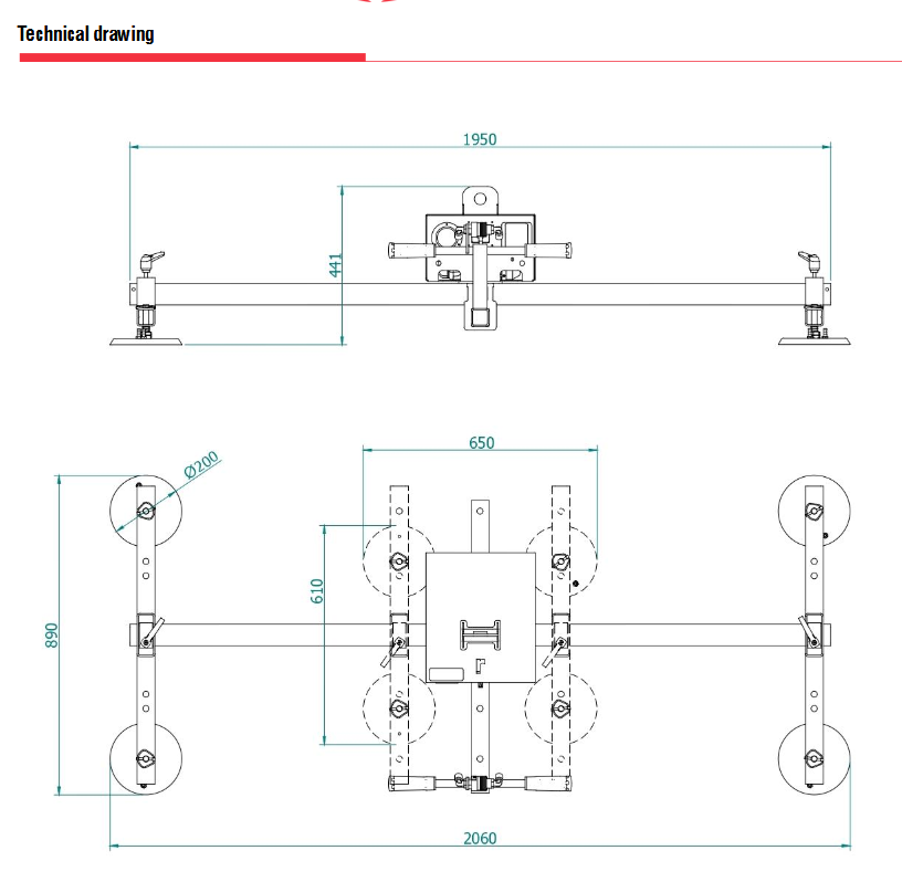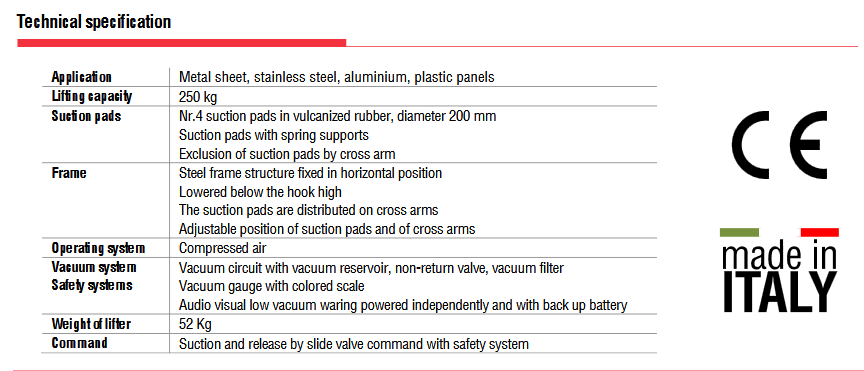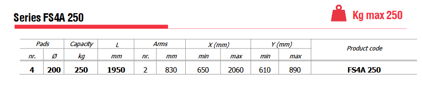 Το μοντέλο FS4A 250 έχει μέγιστη χωρητικότητα 250 kg και 4 βεντούζες κατανεμημένες σε 2 σταυρούς βραχίονες.