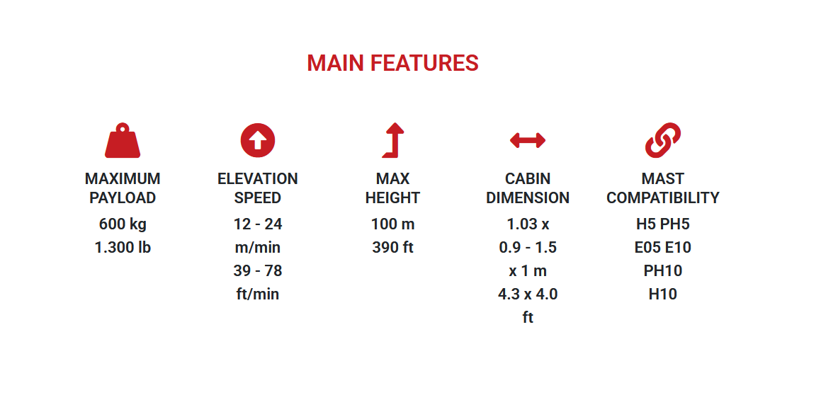 Ανυψωτικό Υλικών H5 Το PH5 είναι μια πλατφόρμα μεταφοράς ατόμων και υλικών που συμμορφώνεται σύμφωνα με το πρότυπο EN 12158 και το νέο ευρωπαϊκό πρότυπο EN 16719. Διατίθεται στα 12 m/min (μέγιστη επιτρεπόμενη ταχύτητα σύμφωνα με τους κανονισμούς) ή σε έκδοση διπλής ταχύτητας 12/24 m/min με μετατροπέα (VFC) για μικτή χρήση πλατφόρμας μεταφοράς/ανυψωτικό υλικών. Διατίθενται επίσης ως ανυψωτικά μόνο υλικών με αυτόματο έλεγχο στα πλατύσκαλα. Και οι δύο εκδόσεις διατίθενται επίσης με μονοφασική ισχύ 220 V και μέγιστη απαιτούμενη ισχύ 3 Kw. Η πλατφόρμα μεταφοράς PH5 είναι ιδανική για χρήση όταν υπάρχει λίγος διαθέσιμος χώρος ή όταν δεν υπάρχει τριφασικό ρεύμα. Ένα άλλο πλεονέκτημα της πλατφόρμας μεταφοράς PH5 είναι ο ελάχιστος απαιτούμενος χώρος για μεταφορά με υψηλή εξοικονόμηση κόστους. Η διατομή ιστού είναι η ίδια με τα E05 και P08.