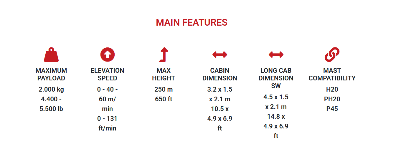 Το ανυψωτικό κατασκευών SAEclimber E20 που συμμορφώνεται σύμφωνα με το πρότυπο EN 12159. Διατίθεται σε 3 διαφορετικές διαμορφώσεις κινητήρα με τις ακόλουθες ταχύτητες: 28 m/min, ó 40 m/min (με VFC) ó 60 m/min (με VFC). Διατίθεται σε έκδοση με έναν ή δύο κλωβούς με ωφέλιμο φορτίο 2.000 kg ανά καμπίνα. Το E20 έχει σχεδιαστεί για χρήση σε πολύ έντονες συνθήκες εργασίας, σε πολυώροφα κτίρια και όταν πρέπει να ανυψωθούν πολλά άτομα και υλικά. Το τμήμα ιστού είναι συμβατό με το ανυψωτικό μας Only Goods H20 και την πλατφόρμα μεταφοράς PH20, καθώς και με την πλατφόρμα εργασίας αναρρίχησης ιστού P45.