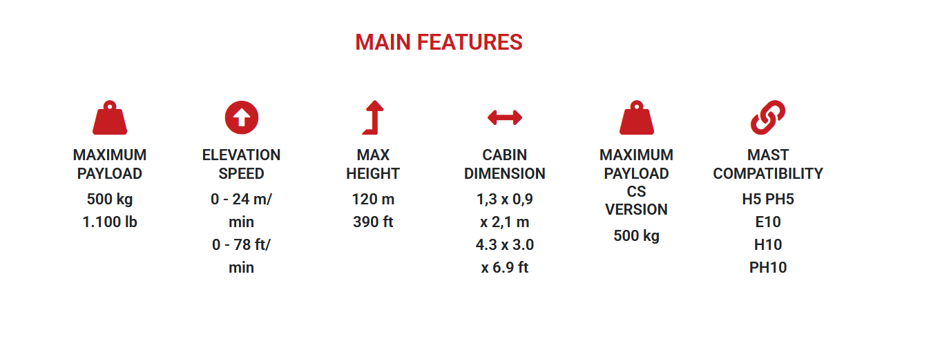 Our smallest Construction hoist E05 for Passengers and Materials has been designed according to EN 12159. E05 is a compact and reliable hoist conceived for narrow spaces. Available in 2 different motor configurations with the following speeds: 20 m/min or 36 m/min (with VFC). Payload is 500 Kg. Also available the version with 300 Kg capacity and mimimun cabin dimensions for 2 persons only. The E05 P&M hoist is made to be used when only a minimum space is available or when a service elevator is needed. It is perfect to be used as tower crane service lift. Mast Section is the same as the PH5 del PH10 e del E10