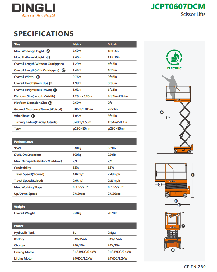 Dingli JCPT0607DCM | Electric scissor lift with working height 5.6 meters and lifting capacity 240 kg