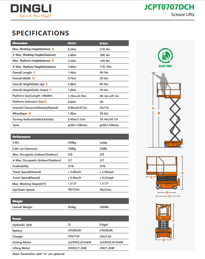 Dingli JCPT0707DCH | Ηλεκτρική ψαλιδωτή πλατφόρμα εργασίας με ύψος εργασίας 6.5 μέτρα και ανυψωτική ικανότητα 240 κιλά