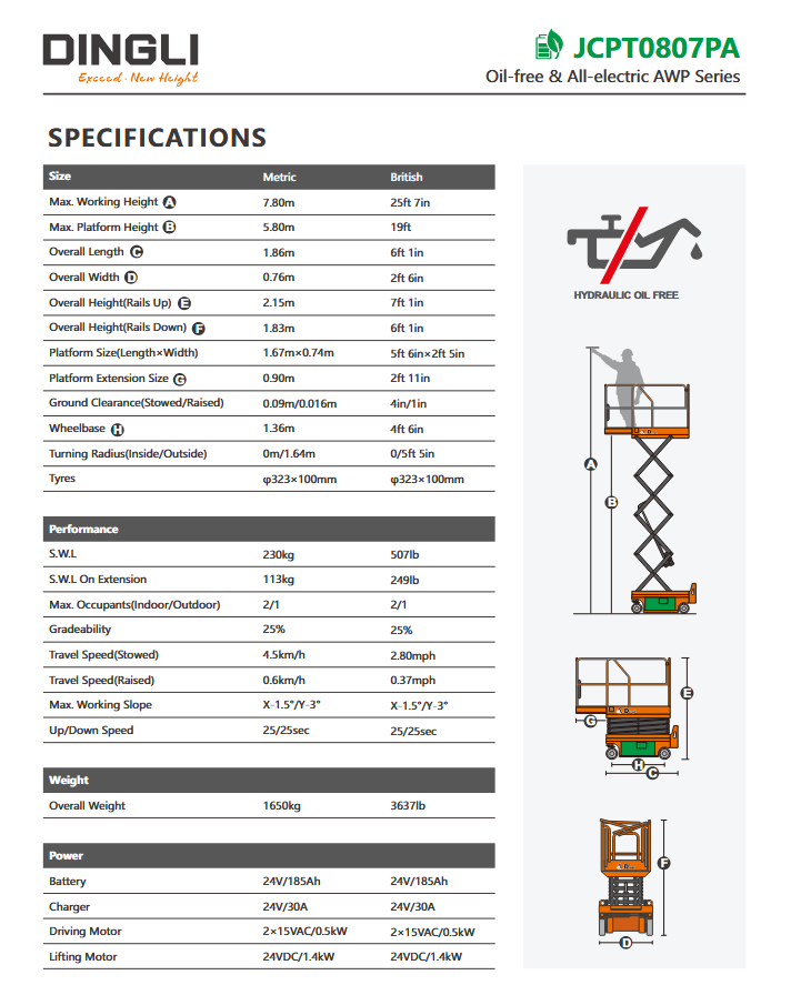 The JCPT0708PA is a fully electric, oil-free scissor lift that features high energy efficiency, with a direct drive system achieving 95% transmission ..