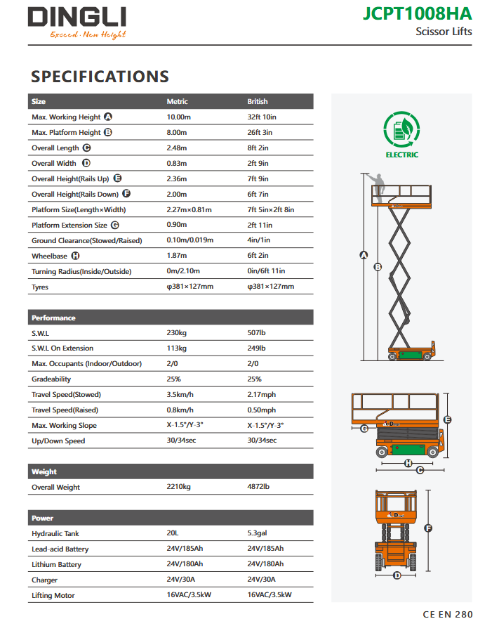 The JCPT0808PA is a fully electric, oil-free scissor lift using electric actuators for lifting, lowering, and steering—completely eliminating the need..