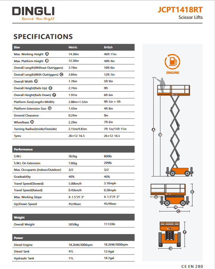 Dingli JCPT1418RT | Ντίζελ ψαλιδωτή πλατφόρμα εργασίας με ύψος εργασίας 14.3 μέτρα και ανυψωτική ικανότητα 363 κιλά