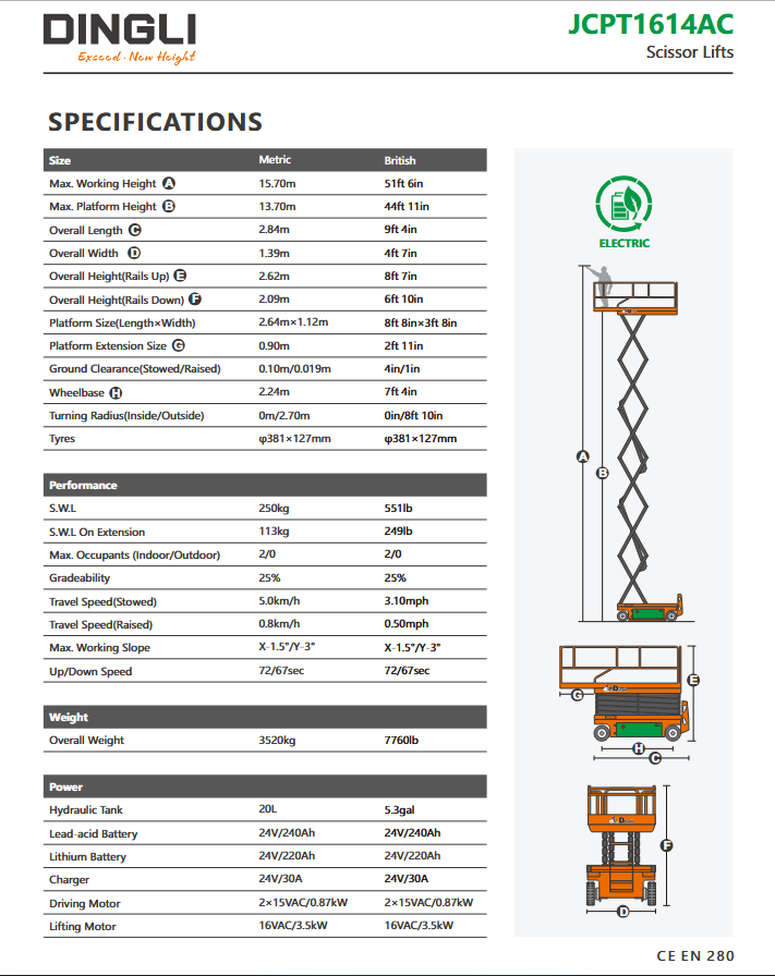 Dingli JCPT1614AC | Electric scissor lift with working height 15.7 meters and lifting capacity 250 kg