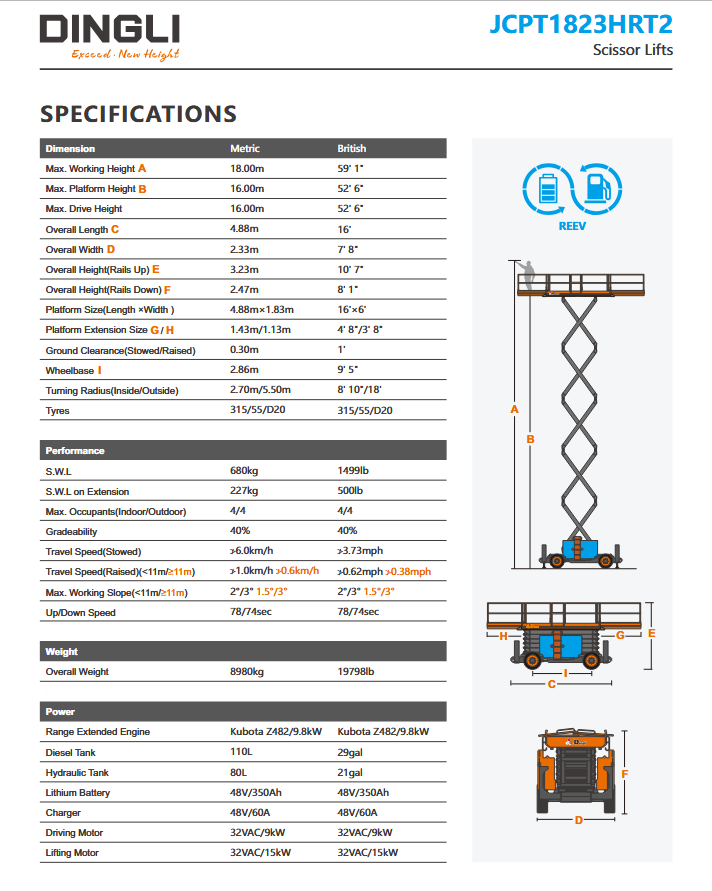 Dingli JCPT1823HRT2 | Υβριδική ψαλιδωτή πλατφόρμα εργασίας με ύψος εργασίας 18 μέτρα και ανυψωτική ικανότητα 680 κιλά