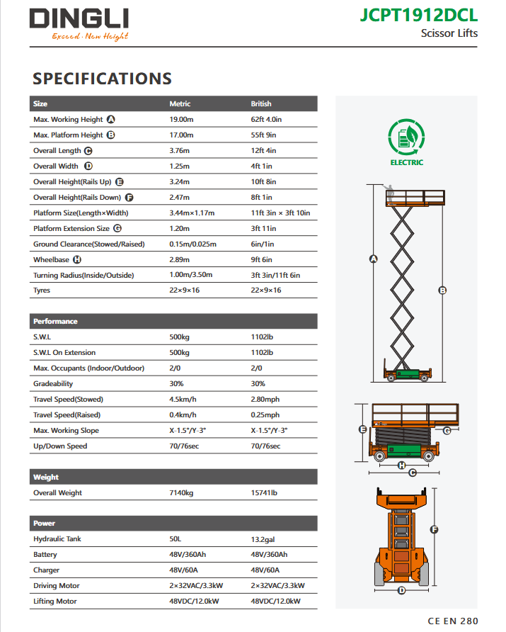 Dingli JCPT1912DCL | Ηλεκτρική ψαλιδωτή πλατφόρμα εργασίας με ύψος εργασίας 19 μέτρα και ανυψωτική ικανότητα 500 κιλά