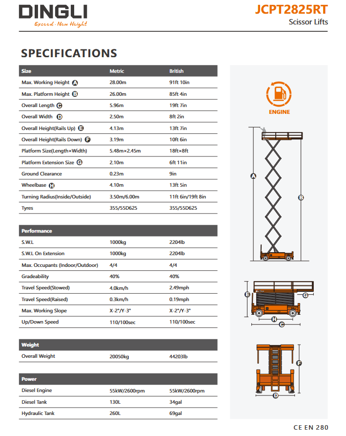 Dingli JCPT2825RT | Ντίζελ ψαλιδωτή πλατφόρμα εργασίας με ύψος εργασίας 28 μέτρα και ανυψωτική ικανότητα 1000 κιλά