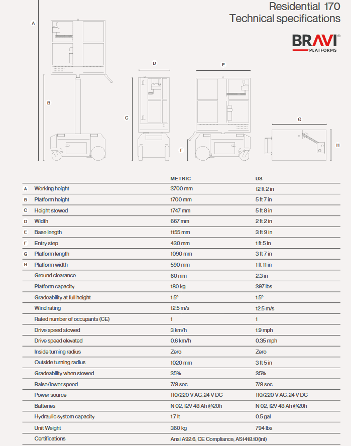 Με την Residential 170, η Bravi Platforms καλύπτει τις ειδικές ανάγκες του οικιστικού κατασκευαστικού τομέα. Περίπου το 33% των εσωτερικών εργοταξίων παγκοσμίως αφορά οικιστικά κτίρια, και η Residential 170 είναι η πρώτη πλατφόρμα που έχει σχεδιαστεί ειδικά για αυτήν την αγορά. Ο σχεδιασμός της δίνει προτεραιότητα στην ασφάλεια, την άνεση του χειριστή και την παραγωγικότητα.