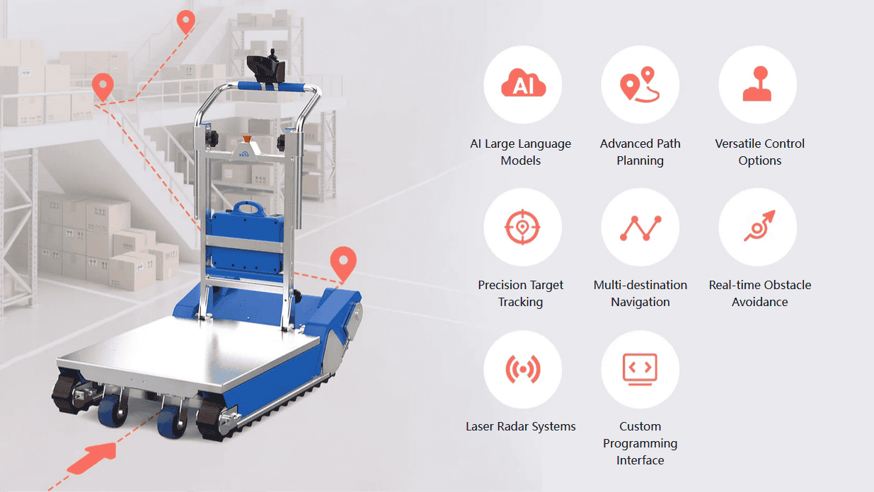 Αυτόνομος έλεγχος με τεχνητή νοημοσύνη που επιτρέπει στο ρομπότ να αντιλαμβάνεται το περιβάλλον, να λαμβάνει αποφάσεις σε πραγματικό χρόνο και να προσαρμόζει την πορεία του για ασφαλή και αποτελεσματική μεταφορά φορτίων.