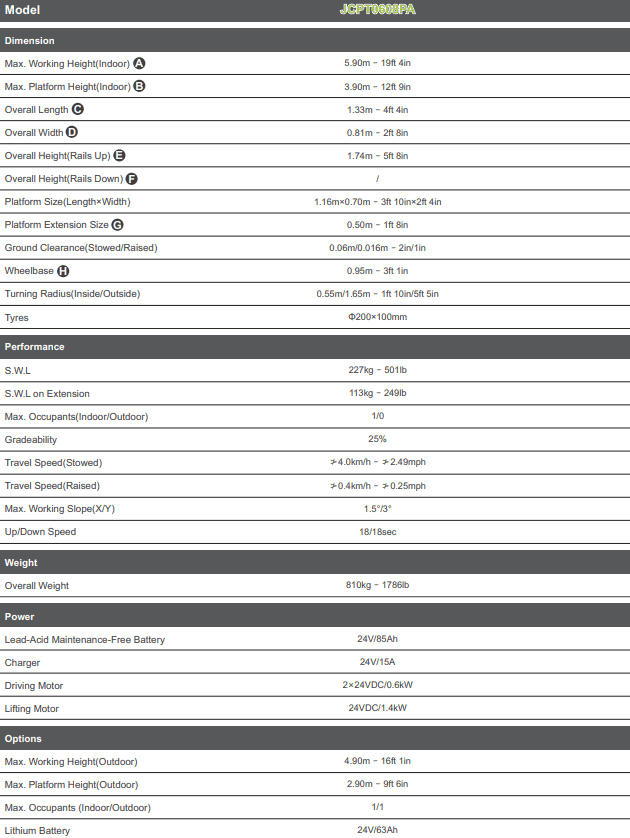 Η JCPT0608PA διαθέτει ηλεκτρικό σύστημα κίνησης υψηλής απόδοσης, προσφέροντας αθόρυβη λειτουργία και μειωμένη κατανάλωση ενέργειας. Είναι εξοπλισμένη με μπαταρία 24V / 85Ah χωρίς συντήρηση και φορτιστή 24V / 15A, εξασφαλίζοντας αξιόπιστη καθημερινή χρήση. Η ομαλή ανύψωση και κατάβαση βελτιώνει την ασφάλεια και την άνεση του χειριστή.