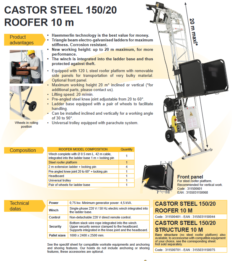 Building site hoist with interlocking ladder sections, in aluminium profile.Load capacity 150 kg.New adjustable knee joint from 0 to 40°.Adjustment fl..