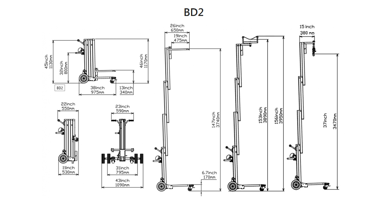 - With the masts at the bottom level the height of the BD2 is 1117mm!