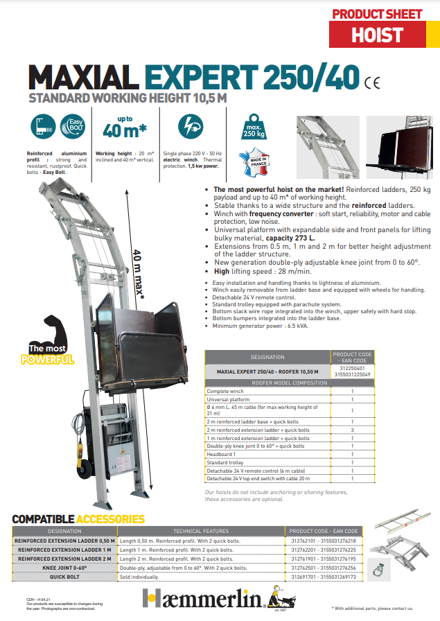 The most powerful hoist on the market! Reinforced ladders, 250 kg payload and up to 40 m of working height.Stable thanks to a wide structure and the r..