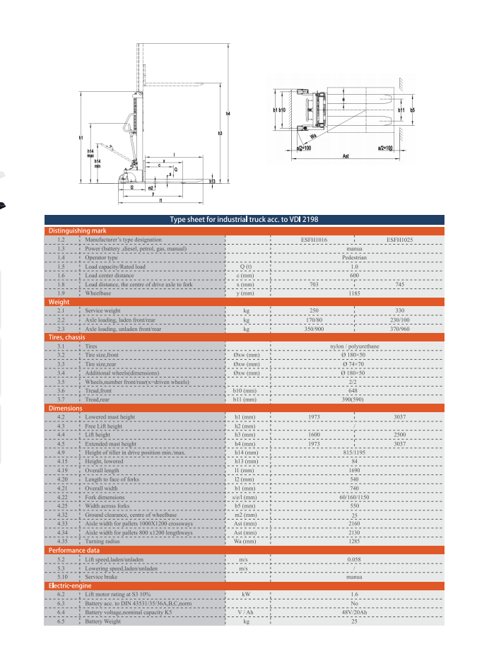 - The semi-electric stacker ESFH1025 is a powered solution made in a basis of traditional manual stacker for simplification of manual loading & unloading operations where the frequency of these operations is not high enough for use of fully powered or traditional semi-electric solutions.The truck is designed to be used in more occasional operations ,rather than systematic load handling proccess.