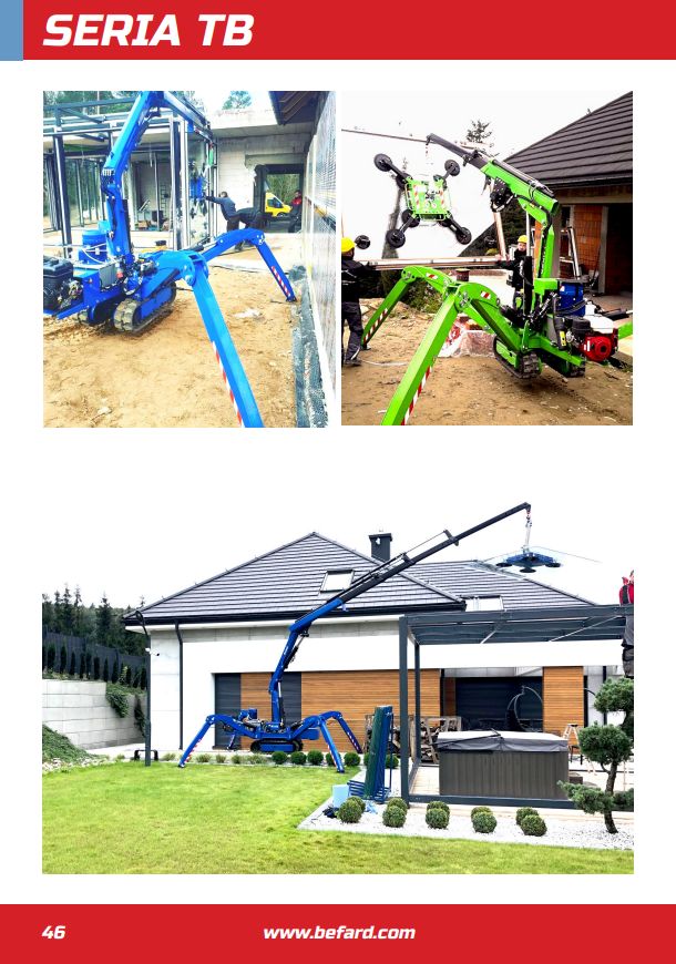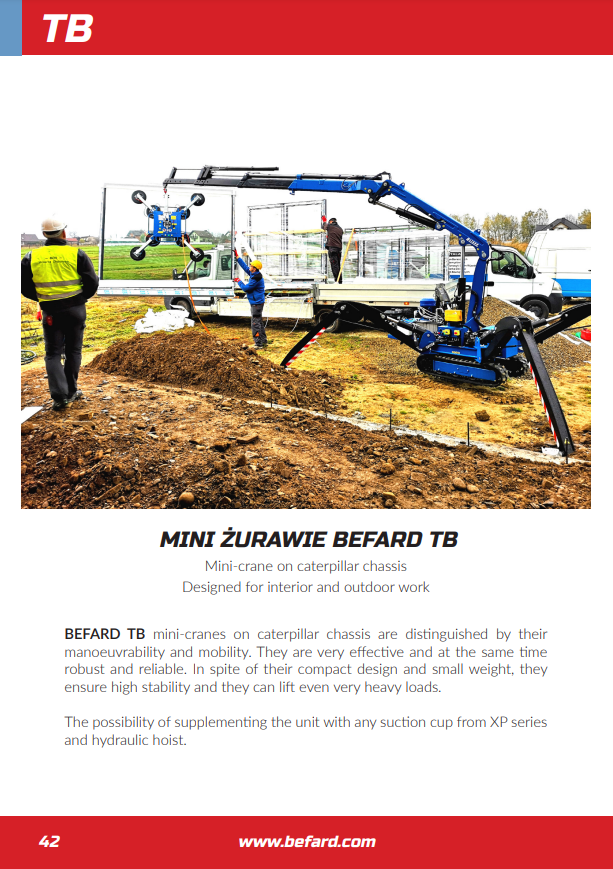 - Mini cranes on BEFARD TB tracked chassis for indoor and outdoor use stand out thanks to their maneuverability and mobility.