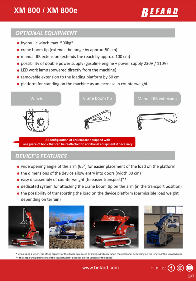 - PICK and CARRY tracked mini crane with column rotation function BEFARD XM 800 radio-controlled with non-marking tracks that allow you to work indoors and outdoors, e.g. in production halls.