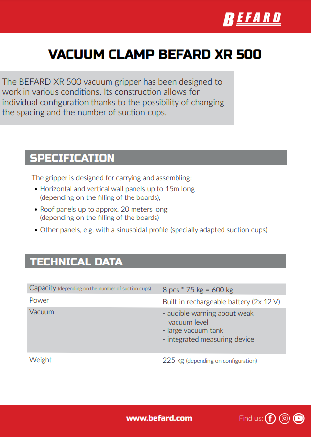 BEFARD BATTERY VACUUM FOR LIFTING PANELS XR500 - 14M 500KG