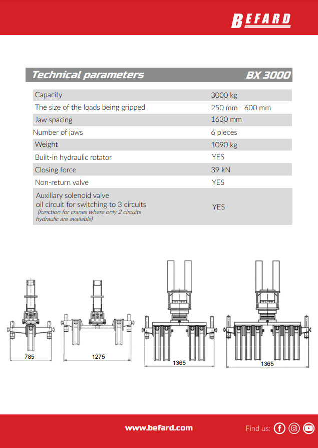 The BEFARD BX1000 industrial manipulators can perform three hydraulic functions: gripping, pivoting and tilting. They are attached to the crane extension with a flange.