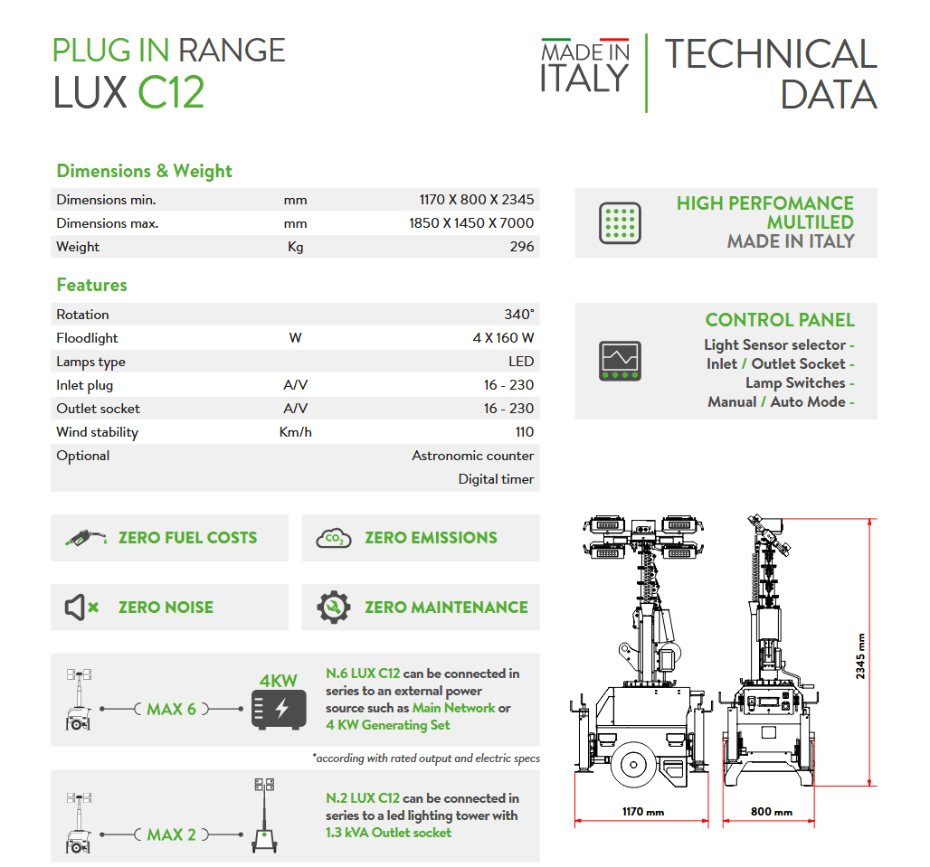 - Up to n.2 LUX C12 can be connected in series to a 1.3 kVA auxiliary socket supplied on our towers with integrated generator.
