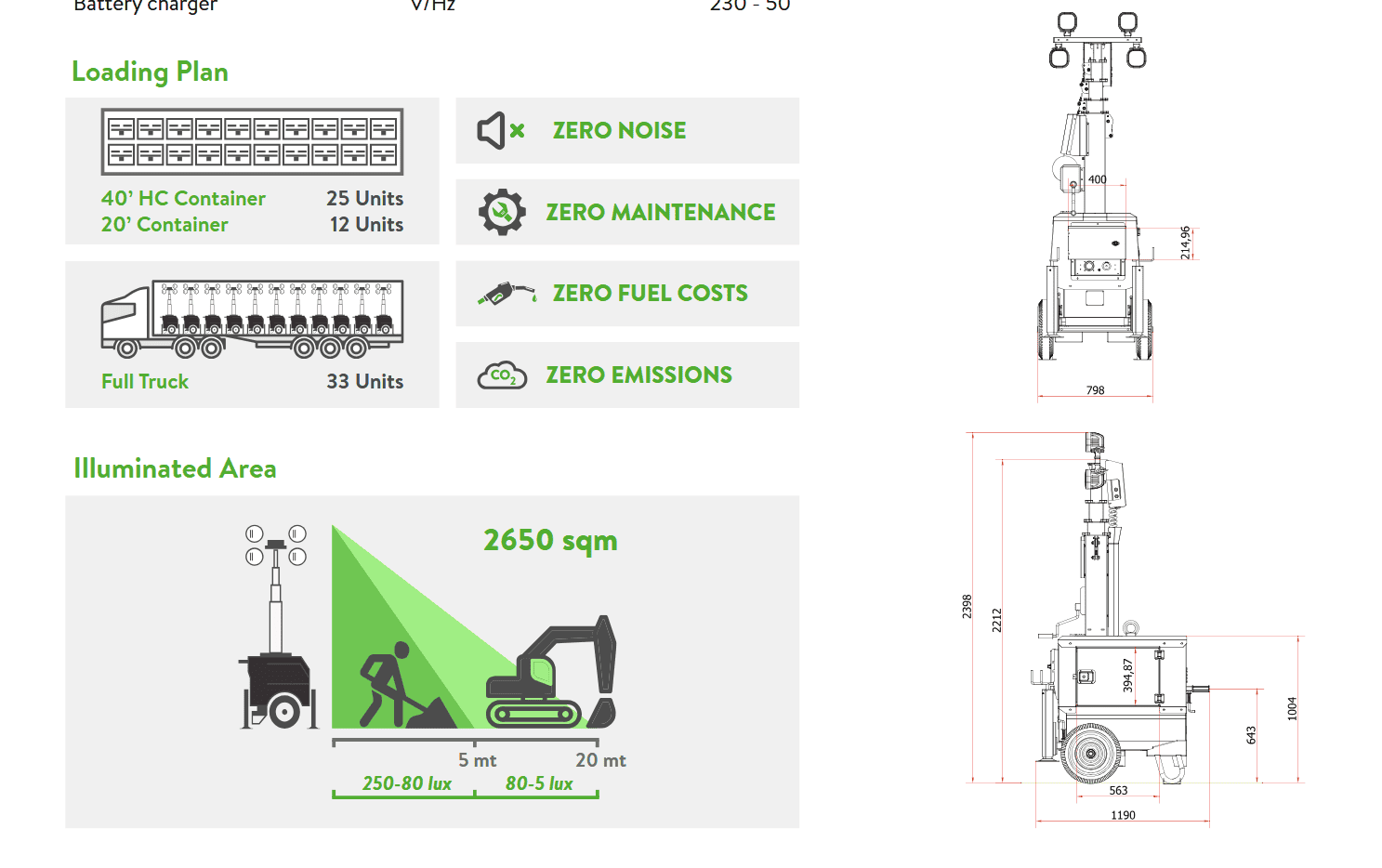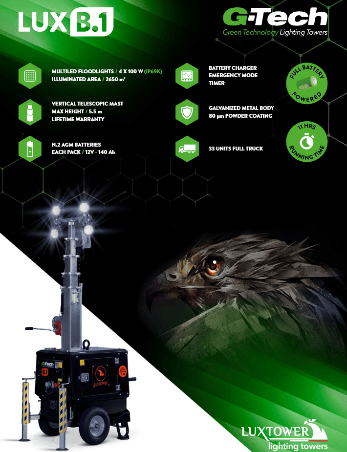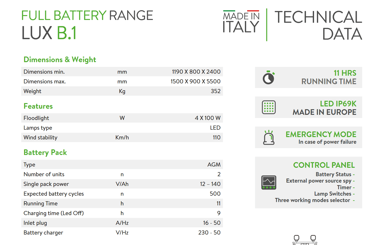 Lux B.1 is one of the most compact and innovative lighting towers in the sector, it doesn’t require any maintenance and fuel-related costs because entirely battery powered. The outcome is a high performance, zero emission, sustainable product.
