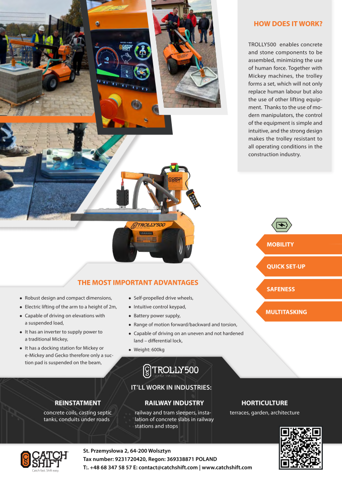 TROLLY 500 enables the installation of concrete and stone elements, limiting human work to a minimum. Along with the Mickey series machines, the trolley is a set that will replace not only the work of people but also the use of other lifting devices. The use of modern manipulators makes controlling the device simple and intuitive, and the durable structure makes the trolley resistant to all working conditions in the construction industry.