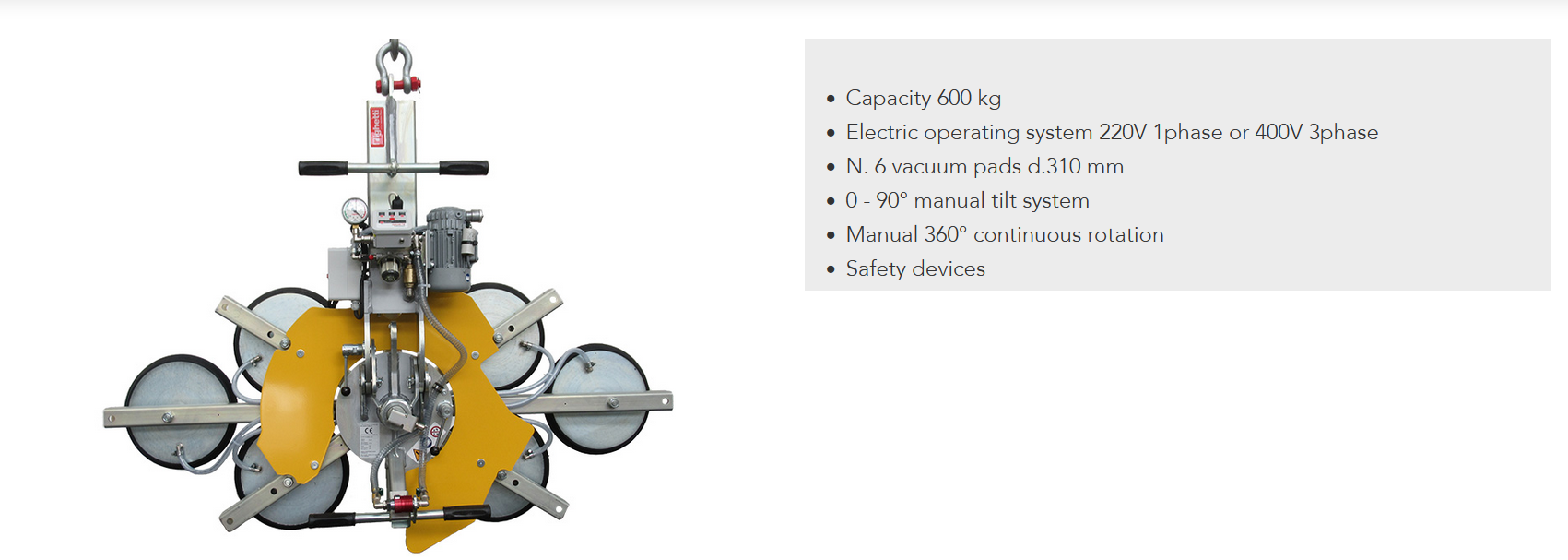 The model VEB6 RCMBM is a glass vacuum lifter with 6 vacuum pads d. 310 mm, 600kg capacity and electric operating system, which can be 400V 3phase or 220V 1phase.The vacuum lifter VEB6 features manual 0-90° tilt and manual 360 degree rotation.One vacuum circuit with vacuum tank and safety devices, guarantee security on lifting and handling big glass panels.