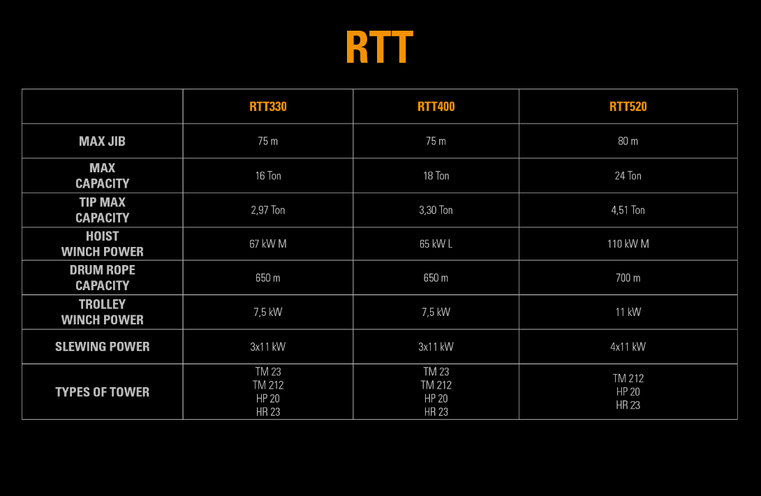 - The RTT Range has lifting capacities ranging from 16 Tons to 40 Tons and can be configured with maximum outreaches from 75m to 85m.
