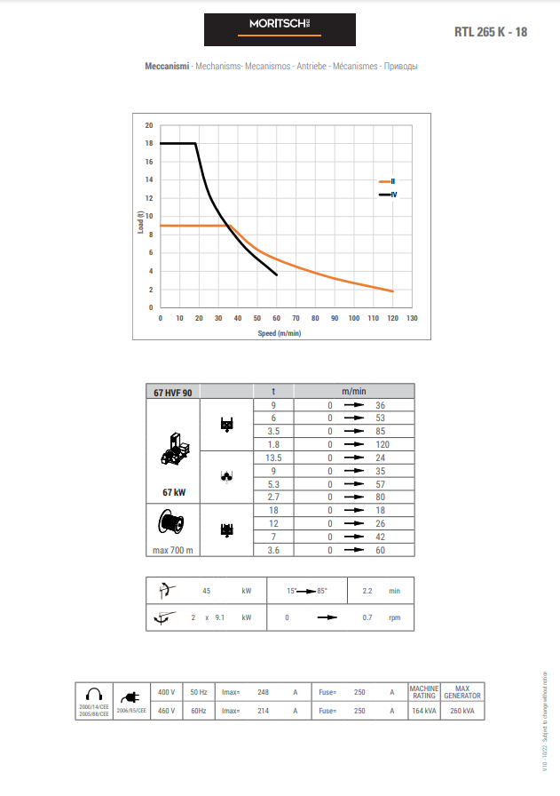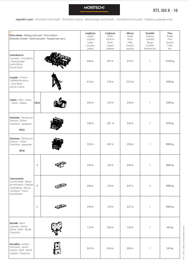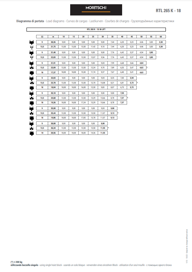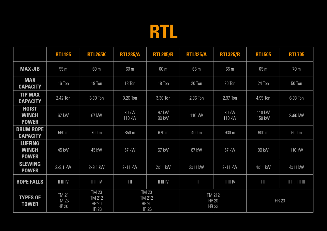 - The RTL range has fixed counter-jib ballasts and lifting capacities from 16 tons to 50 tons, available with single rope fall (versions A) or standard rope fall II III IV (version B).