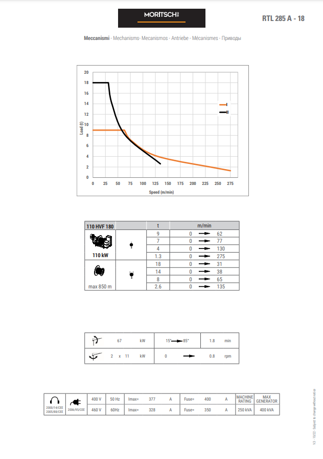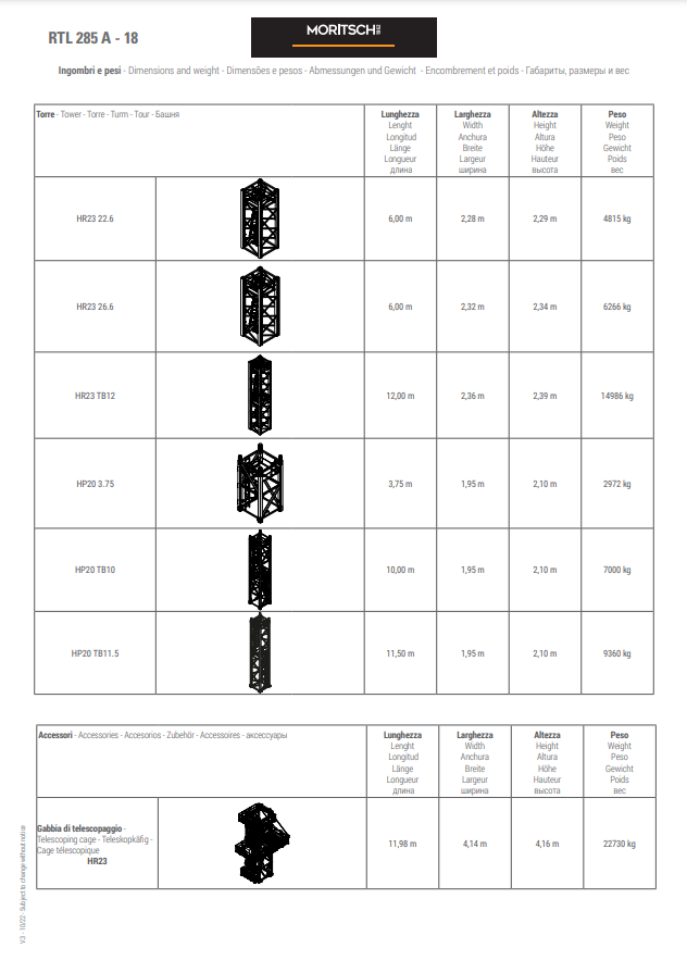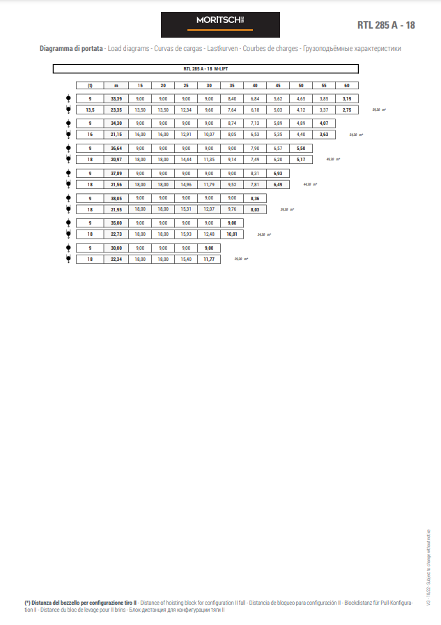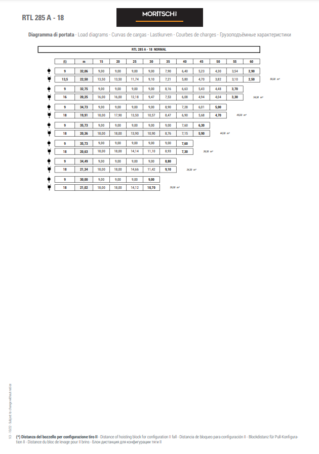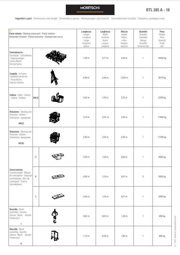 - The RTL range has fixed counter-jib ballasts and lifting capacities from 16 tons to 50 tons, available with single rope fall (versions A) or standard rope fall II III IV (version B).