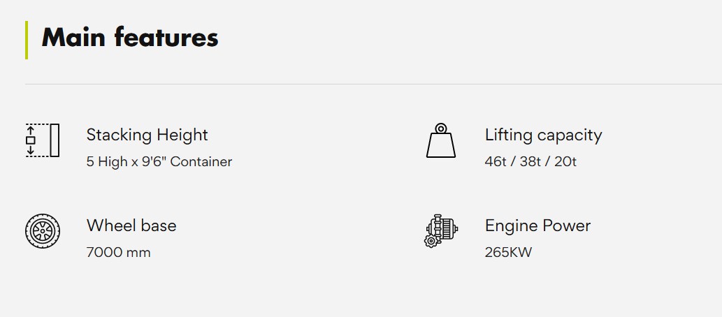 equipped with a spreader and a Piggy Back is available in a heavy or standard version with a capacity of 45t in first line and 5 stacking heights.