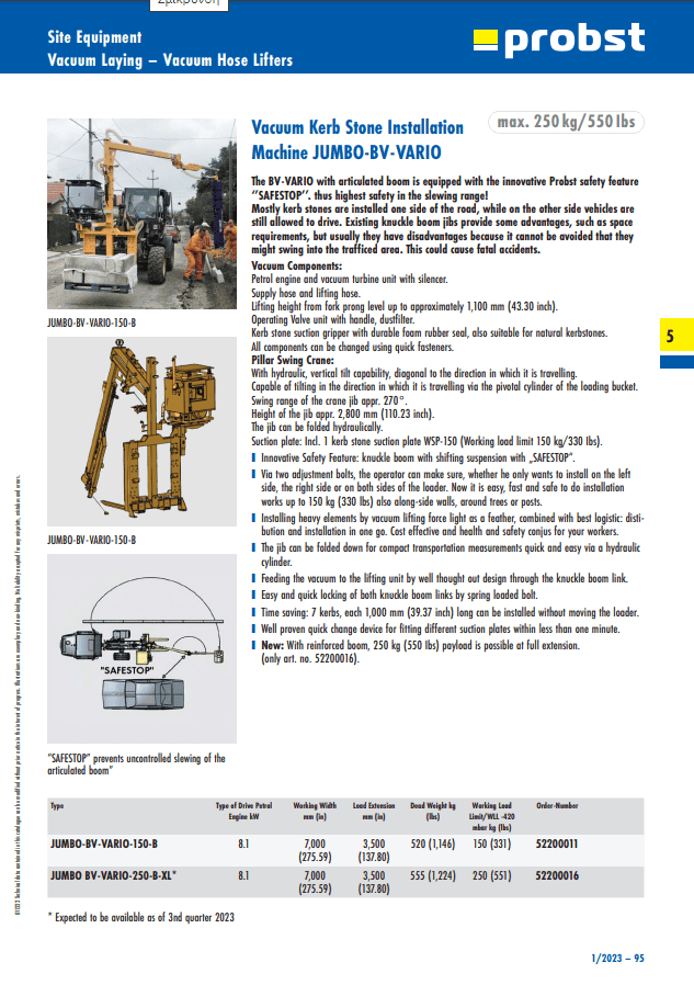 - Probst JUMBO-BV-VARIO | Vacuum Kerb Stone Installation Machine | 250 kg