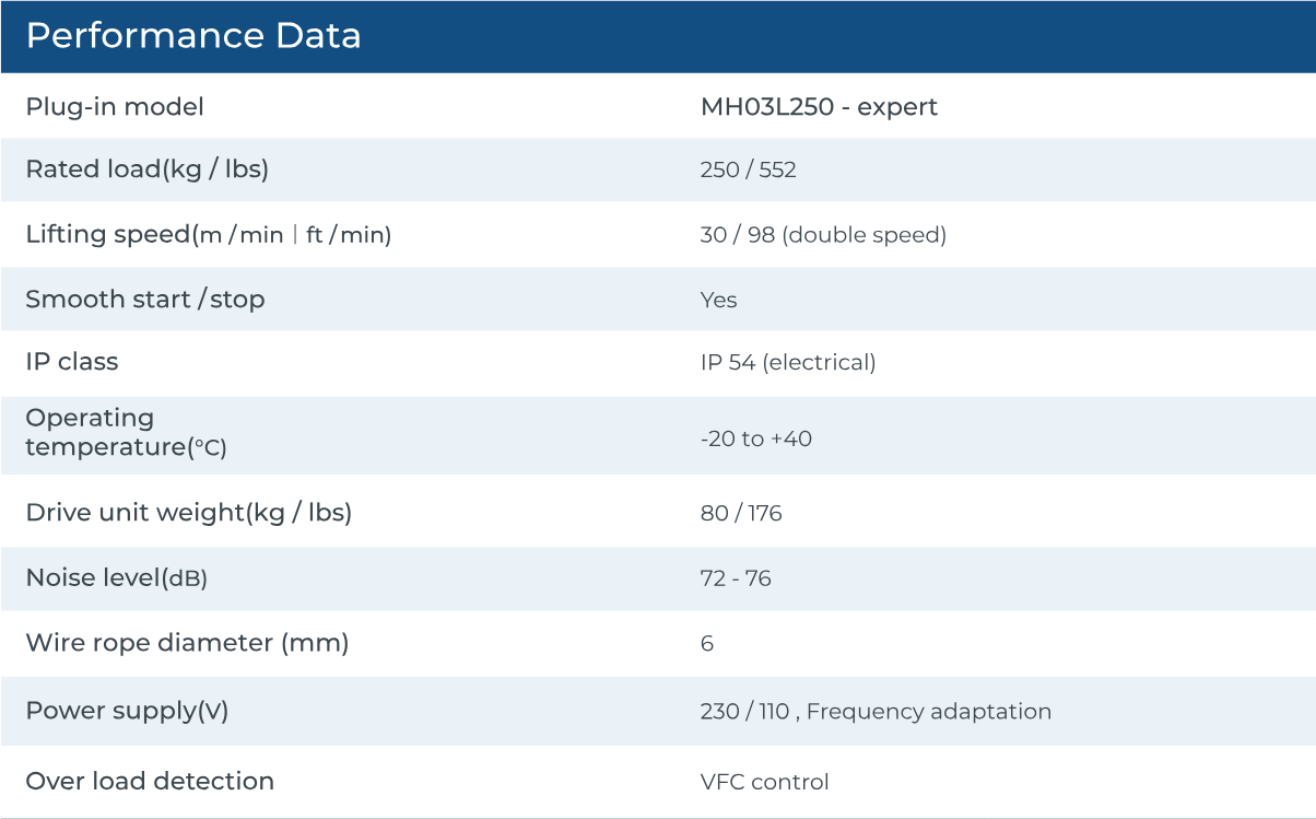 The MH03 series plug-in ladder hoist models deliver high performance, reliability, and flexibility for applications such as lifting solar panels and construction materials. They support a rated load of up to 250 kg, with lifting speeds reaching 30 meters per minute (double speed) and a maximum lifting height of up to 30 meters, depending on the model. The units operate on 230V or 110V power supply with frequency adaptation, and motor power can reach up to 1050 W. The 6 mm wire rope is standard, and all models come with IP54 ingress protection and an operating temperature range from -20°C to +40°C. Smooth start and stop functionality is included, along with overload detection via the patented VFC system, allowing up to 10% overload tolerance. Noise levels range between 72 and 76 dB, while the MH03L125 model operates on inclines between 50° and 70°. The drive unit weight varies between 55 and 65 kg, depending on the model.