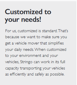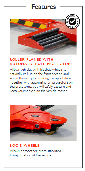 Equipped with bogie wheels, Stringo PLUS can ride over bumps and obstacles, like uneven floor surfaces or transitions. The machine carefully transports your vehicle long distances over rough ground. This terrain capability allows you to go faster, a feature that will decrease your loading time. - Outstanding stability