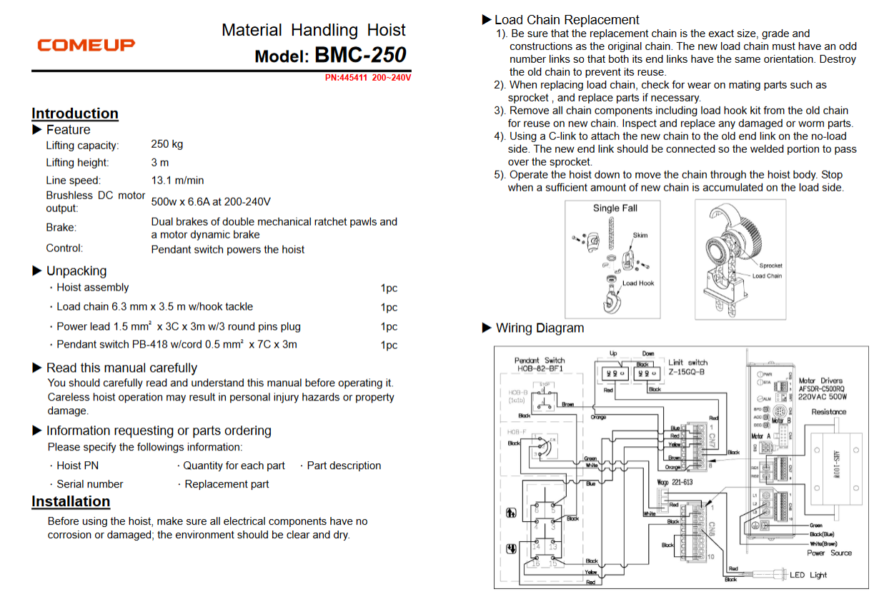 BMC-250 Brushless DC Motor Chain Hoist for versatile lifting tasks - 250 kg lifting load