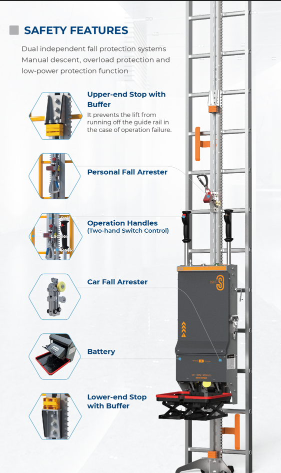 - Dual fall protection system (independent fall arresters for the car and the operator)