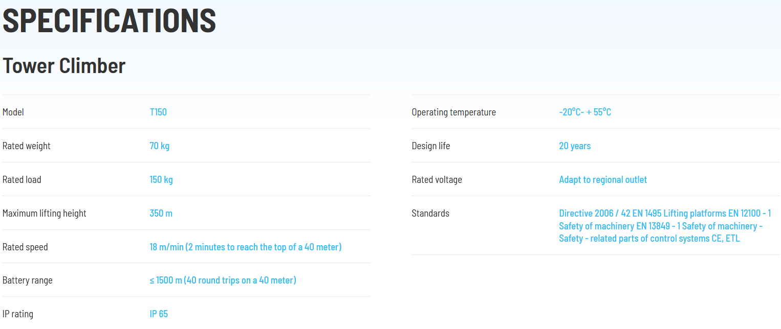 The Tower Climber is a battery-powered auxiliary lifting equipment, which can be used in tower crane, wind tower, high voltage tower, bridge tower detection, oil refinery, cooling tower, granary, storage warehouse and other fields. The product has high safety, smooth operation, compact structure design and simple operation, which can greatly improve the safety and efficiency of climbing personnel, and obtain CE certification.