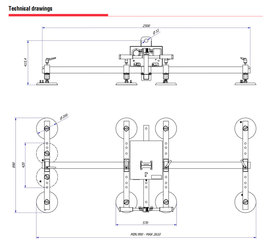 Horizontal fixed steel frame L 2500 mm, 8 suction cups positioned on 4 arms and the arms can be freely moved along the crossbeam to adapt to different sheet sizes, make the FS8 lifter an excellent tool for handling different sizes of sheets metal.