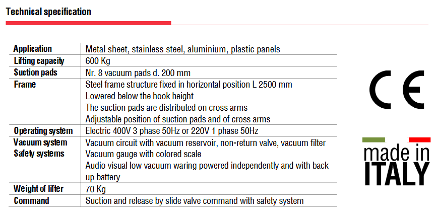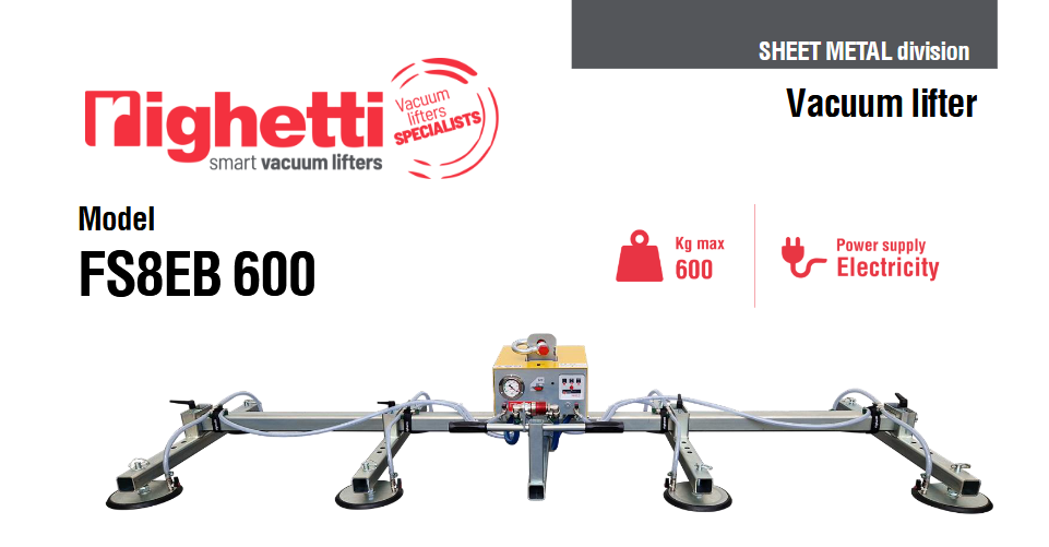 ELECTRIC VACUUM LIFTER for metal sheets RIGHETTI FS8EB 600kg