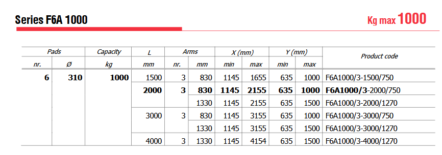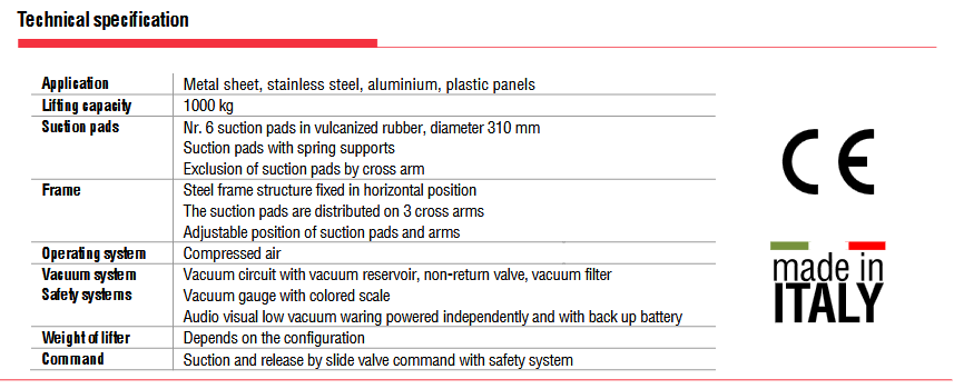 The model F6A 1000 has a maximum capacity of 1000 kg and 6 suction pads distributed on 3 cross-arms.